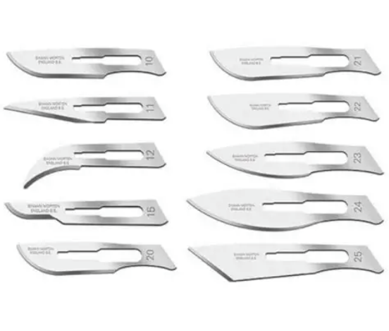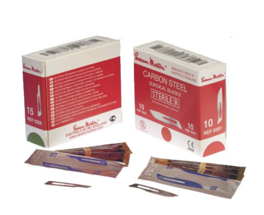 Lame de bistouri SWANN MORTON stérile à usage unique. Lames de bistouri SWANN MORTON N° 10, 11, 12, 15, 20, 21, 22, 23 et 24 s’adaptant sur tous manches de bistouris de norme B52982. Lames de scalpel en acier au carbone. Stérilisation aux rayons Gamma. Lames de bistouri conditionnées individuellement sous feuillet métallique avec protection anti-corrosion.