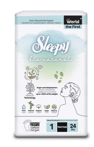 La gamme Sleepy Bio Natural hygiène féminine propose des protège-slips et serviettes fabriqués avec des matériaux d’origine naturelle, pour une protection absorbante tout en douceur et respectueuse de la peau.